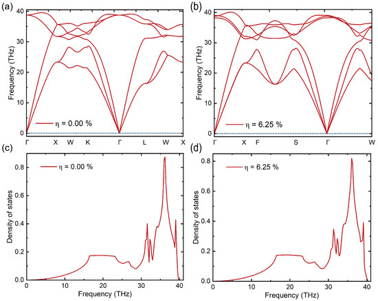 A supercell model was constructed to calculate the phonon band structure and corresponding phonon density of states of diamond in both the ground state ( = 0.00%) and the excited state ( = 6.25%), along high-symmetry directions in the first Brillouin zone, as shown in Figure 4. As illustrated in Figure 4a,b, no imaginary frequencies appear throughout the Brillouin zone, confirming the dynamical stability of the excited-state structure despite the altered electronic configuration. Compared with the ground state, the degeneracy of the optical branches in the excited state is significantly reduced. A distinct splitting of the transverse optical modes is observed along the direction (Figure 4b), indicating a reduction in crystal symmetry induced by electronic excitation. Further analysis of the phonon density of states reveals that the dominant vibrational modes are concentrated in the high-frequency region (30–35 THz).
