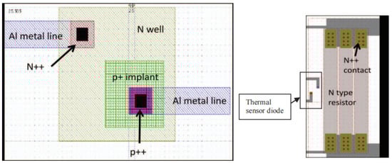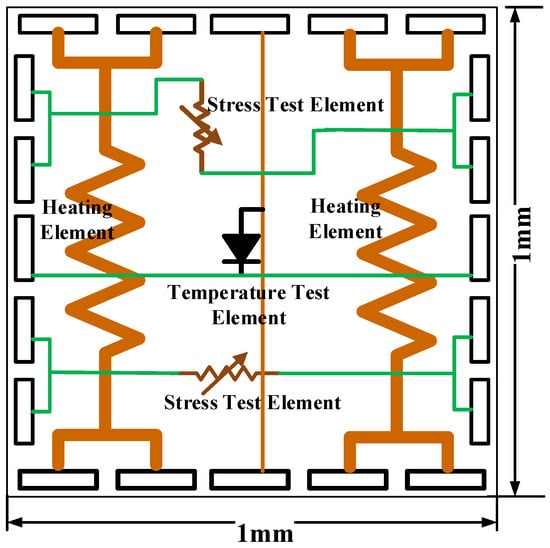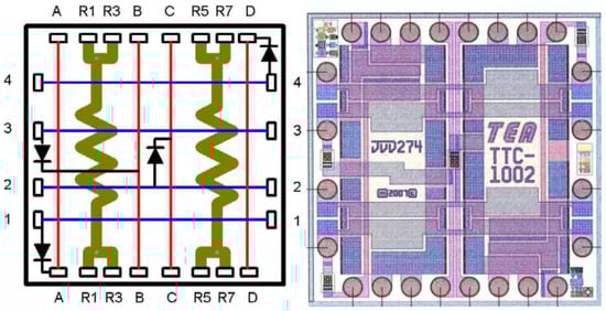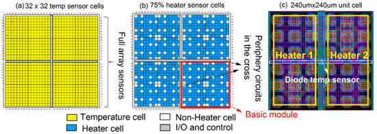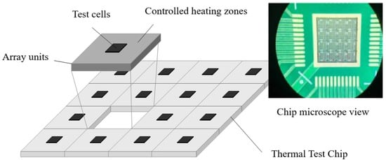 29]. The chip’s design is predicated on the fundamental unit cell structure, with its core composition comprising metal film resistors and diode temperature sensors, as illustrated in
