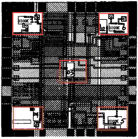 Figure 4. The chip’s architecture comprises four sets of symmetrically distributed polysilicon heating elements situated beneath the aluminum corrosion test structure. These heating elements are energized by a current, thereby generating Joule heat to simulate local or global thermal gradients. The temperature-sensitive sensor element consists of an array of 48 p
