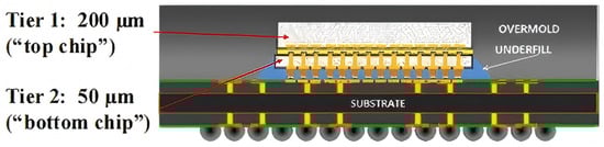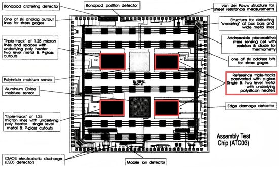 VBE) as a function of temperature. The linear slope of this measurement is approximately −0.488 °C/mV. The stress sensor element is composed of 48 piezoresistive stress sensor cells, each containing four p-type and four n-type doped resistors arranged in the directions [100] and [110], respectively. Resistor and diode addressing is achieved through CMOS transmission gates, and the change in resistivity of single crystal silicon due to mechanical stress is utilized to invert the stress tensor component. The fabrication process of the chip entails the growth of a 1.9 μm thick field oxide layer on a silicon substrate, the deposition of an aluminum conductor pattern, the implementation of a PETEOS (plasma-enhanced tetraethyl orthosilicate) layer as an interlayer dielectric, the covering of the passivation layer with bonding windows, and the assembly of the chip with a silver-filled thermoplastic binder to ensure its stability. The heater power density is up to 25 W/heater with a total power limit of 100 W. The temperature measurement range is from 25 °C to 100 °C, with practical applications up to 150 °C. The temperature measurement accuracy of the array diode is ±0.006 °C/mV for the slope error, and the edge diode has a slope of −0.761 °C/mV with a standard error of ±0.042 °C/mV. The stress measurement range encompasses both package and thermal stresses. The temperature difference between the experimental and FEM (finite element method) analysis is approximately 3 °C/W, which primarily originates from the thermal resistance of the chip mounting layer. The ATC03 chip is extensively utilized in the measurement of thermal resistance distribution of three-dimensional multi-chip modules, evaluation of the packaging process, reliability testing, and optimization verification of high thermal conductivity materials.