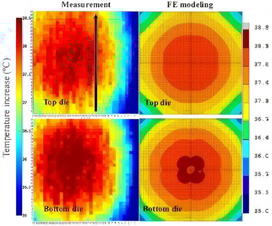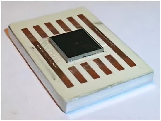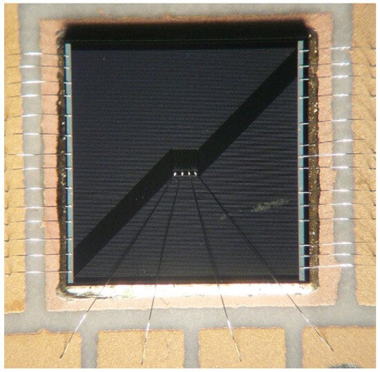 Figure 6. Each base unit integrates two metal film resistors, with a nominal resistance value of 11 Ω. The heating element occupies 86% of the effective area within the unit, in strict compliance with the JESD51-4 standard on the proportion of the heating area requirements. The four-wire Kelvin connection is employed to eliminate contact resistance during measurement of the interference. The metal film resistor exhibits an in-wafer resistance deviation of no more than ±5%, with a deviation within the 4 × 4 array controlled to ±2%. It possesses a low temperature coefficient characteristic, ensuring the stability of power output. The temperature sensing module consists of four diodes, respectively, laid out in the center of the unit, the diagonal corners, and the center of the edge of the position. The module is driven by a 1 mA constant-current source, generating a forward voltage of 0.7 V at 25 °C. Ensuring the measurement’s accuracy necessitates the calibration of the diodes with a K-factor, which has a nominal value of −0.5 °C/mV and a standard deviation of less than 1% post-calibration. Thus, the temperature measurement sensitivity is −2 mV/°C for a current of 1 mA. The fundamental unit size is designed to be 2.54 mm × 2.54 mm, with the capacity for flexible expansion to 3 × 3 to 9 × 11 and other array configurations. The array edge is set up with a width of not less than 150 μm of non-heated area, encompassing the cutting channel, bonding area, and crack suppression structure. The manufacturing process utilizes metal film deposition to form the resistor layer and implements a two-stage wafer dicing process. The initial dicing stage removes the metal interconnect layer, while the subsequent dicing stage completes the grain separation, thereby mitigating the risk of short-circuiting caused by metal residues. Performance tests demonstrate that the maximum power-carrying capacity of a single resistor is up to 11 W. By adjusting the configuration of arrays, it is possible to simulate 65% to 100% coverage of the heating area, with a temperature gradient of approximately 6 °C between the unheated edge area and the core area under full-power conditions. The temperature measurement system utilizes a four-wire connection and K-factor calibration to achieve high-precision data acquisition. The chip’s versatility extends to its applications in thermal resistance analysis, power distribution mapping, and local heat dissipation technology research.