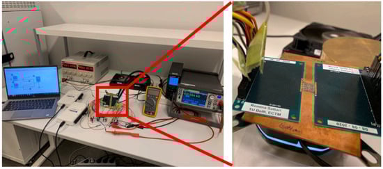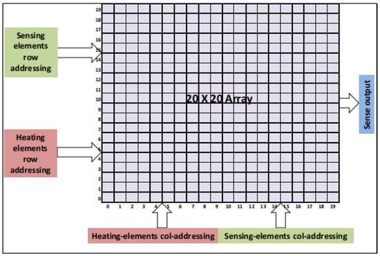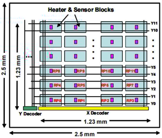 32] designed a thermal test chip structure for testing various packages in order to analyze transient thermal phenomena on LSI (large-scale integration) chips. The chip is fabricated using a standard 0.18 µm CMOS process, and the overall architecture consists of 24 sensor modules arranged in 4 rows and 6 columns, each measuring 1.23 mm × 1.23 mm. As shown in