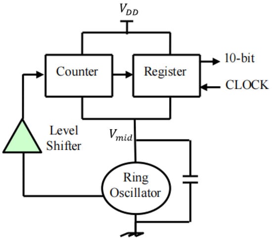 2. The resistor generates heat through the Joule effect, and the ring oscillator generates heat through capacitor charging and discharging and switching frequency. In addition, each heating unit has temperature sensors, which include diodes, resistors, and ring oscillators, and its temperature signal is converted to a digital signal by a digitizing circuit [