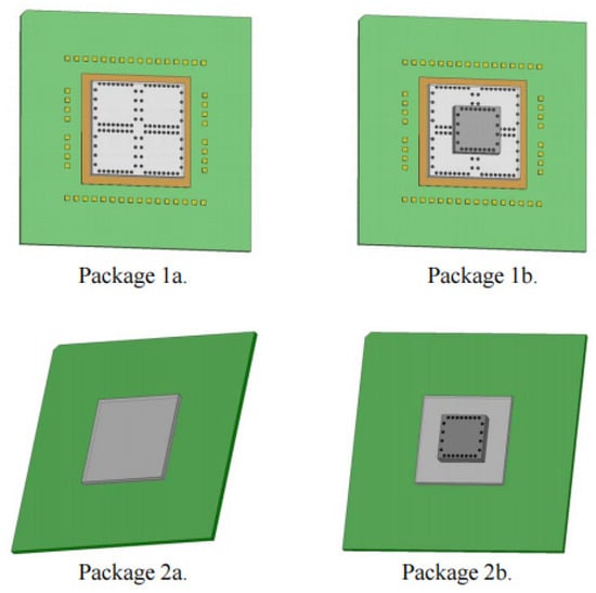 Figure 5, the two thermal test chip structures are represented. The flip chip-type TTC with diode sensor measures 7 mm × 7.3 mm and integrates five resistive heaters: one is distributed at the periphery of the chip, and four are located in four quadrants. The operation of the heaters is based on the Joule-heating principle, which involves the conversion of electrical energy into thermal energy through the impedance of the resistive material at a constant current. The temperature-sensitive element utilizes 19 diodes and is fabricated through a PN junction process. The temperature measurement is achieved by the temperature dependence of the forward voltage drop at constant current, as predicted by the Shockley equation. The chip is then packaged onto a ceramic substrate using C4 (controlled collapse chip connection) flip-flop soldering technology, with 403 C4 solder balls arranged in a circular pattern in the central area of the chip, forming a 23 × 23 array that decreases at the corners. The RTD-type wire bond TTC measures 11.537 mm × 11.537 mm and is equipped with four four-quadrant-distributed resistive heaters, the heating mechanism of which also relies on the Joule heating effect. The temperature-sensitive elements comprise four spiral-shaped RTDs, which are formed by thin-film deposition and photolithography into a spiral structure with a size of approximately 0.05 mm and a nominal resistance of 10 Ω at 22 °C. This configuration enables high-precision temperature measurement by utilizing the resistance–temperature linear relationship. The chip’s design incorporates reliability test structures, including internal and external perimeter lines for detecting chip cracks and a comb structure for studying corrosion and electromigration. The two chips are packaged in the form of C4 flip-soldered ceramic substrates and lead-bonded MQFP (metal-quadrilateral flat package). With regard to performance, the diode’s linear fit demonstrates a maximum deviation of 1 °C across the range of 22–135 °C, while the quadratic polynomial fit exhibits a sensitivity of −1.7 mV/°C and a capability to measure down to 0.1 °C. The RTD exhibits superior linearity, with a maximum deviation of only 0.1 °C and a sensitivity of 0.45 mV/°C. These two components are utilized in a variety of applications, including electronics package thermal resistance measurements, reliability assessments, and thermal design verification. In 1995, H. Shaukatullah of IBM undertook an evaluation of the current-switching method for determining the temperature of thermal test chips with diodes [