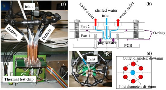 2. The layout of the coaxial structure is designed to optimize thermal homogeneity, while the concentric structure is employed to enhance thermal uniformity. The temperature sensors employed in this system include a BJT-type (bipolar junction transistor-type) analog sensor and an RO-type (ring oscillator-type) digital sensor. The BJT-type analog sensor output is quantized by an external ADC (analog-to-digital converter) with a resolution of 0.4 °C, and the RO-type digital sensor consists of a 9-stage ring oscillator and a 32-bit counter with a sampling frequency of 500 MHz and a resolution of 0.303 °C. The fabrication of the FPTEs is performed on a 130 nm CMOS process that is compatible with standard processes. Currently, the FPTE has been successfully applied to multi-core thermal coupling analysis, package thermal resistance evaluation (fluid cooling thermal resistance 26.9 K/W), and dynamic thermal field prediction (correlation coefficient 0.9846). It is important to note that the FPTE is not a thermal test chip in the traditional sense. However, the FPTE’s functionality is analogous to that of a TTC in that it is capable of generating controlled, time-varying, arbitrary power consumption patterns. Experimental results demonstrate its capacity to generate dynamic sensor outputs that can be converted into temperature data, thereby characterizing the thermal coupling between cores.