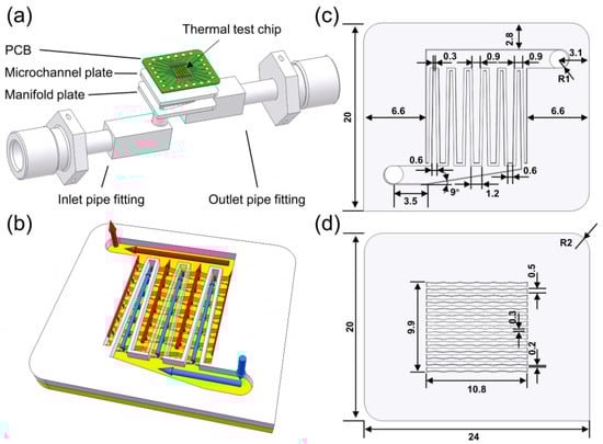 2. Temperature sensors are distributed 5–10 μm from the heating element, and temperature measurement is realized by the negative temperature coefficient characteristic of the forward voltage of the p-n junction, with a sensitivity of −30 mV/°C and a temperature range of 25–200 °C. The chip fabrication process includes ion implantation, high-temperature annealing, PECVD (plasma-enhanced chemical vapor deposition) dielectric deposition, and metallization. The electrical performance tests of the resistors and sensors show that the standard deviation of their resistance values is 0.1–3 Ω, verifying the uniformity and repeatability of the process. The functions of this thermal test chip include verifying the thermal performance of the microchannel cooler and supporting the research of thermal management technology in the field of high-power electronic packaging. The thermal test chip layout and heater design are shown in
