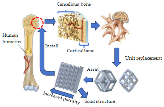 With the continuous acceleration of population aging, there has been a sharp increase in the clinical demand for bone implants [1]. Among these, humeral shaft fractures account for approximately 5–8% of all fractures and 3% of all long bone fractures [2,3]. Currently, one of the major challenges faced by orthopedic implants is the stress shielding effect, which occurs when the significant difference in the elastic moduli between the implant and bone prevents the bone tissue from effectively bearing the load, leading to bone resorption [4,5,6,7]. The human skeleton exhibits a distinct gradient structure, and implants with a gradient design can better simulate the natural bone tissue, thereby enhancing the compatibility between the implant and the bone tissue [8]. Titanium alloy implants with a gradient porous structure can effectively alleviate the stress shielding phenomenon in the femur [9]. However, there is still a lack of understanding regarding the evolution mechanism of implant structure and macroscopic mechanical properties. This study aims to achieve optimal matching between the implant and bone tissue structure by gradient modification of unit cell arrays, coupled with a composite structural design.