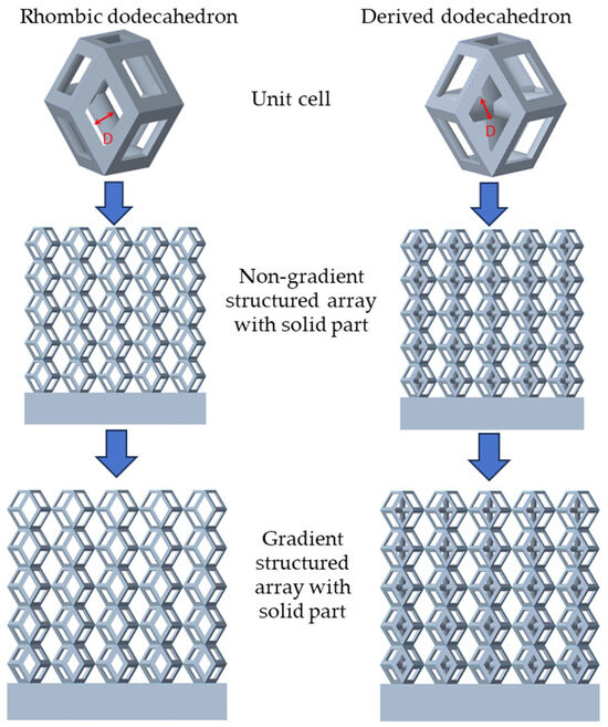 There are various types of unit cells in porous structures, and these structural variations significantly influence the mechanical properties of materials, such as ductility, elastic modulus, conductivity, thermal conductivity, biocompatibility, cell adhesion, and corrosion resistance. By selecting the optimal unit cell and fine-tuning the material’s structure, its performance can be enhanced, making it better suited for practical applications [42]. A rhombic dodecahedron structure, in particular, offers distinct advantages in terms of biocompatibility and cell adhesion, owing to its high porosity and specific surface area. The choice of unit cell also plays a critical role in reducing the anisotropy of the elastic modulus while simultaneously improving mechanical properties, thereby achieving a closer match in elastic modulus with bone tissue. The rhombic dodecahedron has a relatively low elastic modulus and a relatively high porosity, which can avoid stress shielding after implantation of biomimetic bone implants, prolong the service life of implants, and prevent sterile loosening caused by structural failure of implants after long-term implantation. In this study, two-unit cell models—namely the rhombic dodecahedron and a derived dodecahedron—are selected for optimization based on previous research, as illustrated in Figure 2. The modeling software used in this project is Creo Parametric 7.0. By arranging the unit cells along the three principal axes (XYZ), a porous structure model was generated. This array method prepares for gradient processing of the Z-axis unit cells of the model in the future, ensuring that only the Z-axis is variable and the rest are isotropic. The centroid spacing between the unit cells of the rhombic dodecahedron and its derivative dodecahedron along the perpendicular to the direction of the structural gradient of layered structure composed of two types of unit cells is 2.95 mm, which is 0.05 mm less than the distance between the two vertices of the unit cell. This slight reduction ensures that the unit cells can make contact perpendicular to the direction of the structural gradient of layered structure composed of two types of unit cells, preventing significant stress concentration that could arise from point-to-point contact. As mentioned earlier, long bones consist of cortical and cancellous bones. Cortical bone, typically solid, functions as the primary load-bearing component and has a thickness ranging from 0.33 to 3.5 mm [11]. To better mimic natural bone tissue, the experimental model in this study incorporates solid structures of varying thickness beneath the porous scaffold. Additionally, to more accurately replicate the biological properties of cancellous bone, gradient treatment was applied to both porous structures.