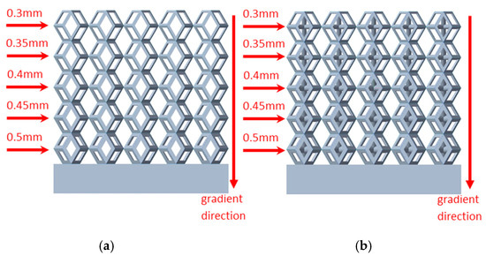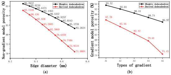 Gradient and non-gradient model porosity. (a) Porosity of non-gradient model with respect to edge diameter of unit cells; (b) Porosity of gradient model with respect to types of gradient of unit cells.