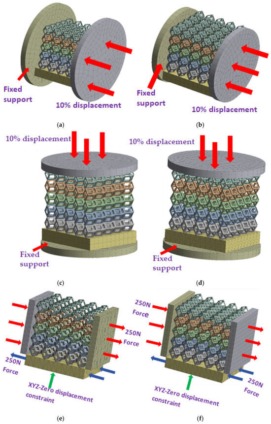 Boundary condition settings for three operating conditions of two structures. (a) Boundary conditions for perpendicular compression of the rhombic dodecahedron gradient model; (b) Boundary conditions for perpendicular compression of the derived dodecahedron gradient model; (c) Boundary conditions for directional compression of the rhombic dodecahedron gradient model; (d) Boundary conditions for directional compression of the derived dodecahedron gradient model; (e) Boundary conditions for shear of the rhombic dodecahedron model; (f) Boundary conditions for shear of the derived dodecahedron model.