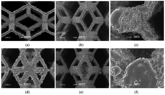 Figure 8a–c depict the morphology, pore size, and microstructure of the rhombic dodecahedron as observed via scanning electron microscopy (SEM). Figure 8d–f illustrate the morphology, pore size, and microstructure of the derived dodecahedron as observed via scanning electron microscopy. The images clearly show that the surface of the struts in the metal scaffold is typically uneven, with particles adhering to it, while the connections between struts exhibit good integrity without obvious fractures. Additionally, the connections between unit cells are well connected. This phenomenon arises from the incomplete melting of titanium alloy particles, which adhere to the strut surface, thereby increasing its surface roughness. This enhanced roughness promotes the adhesion of biological cells to the struts, facilitating cell differentiation and bone regeneration [46].