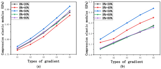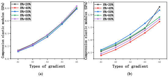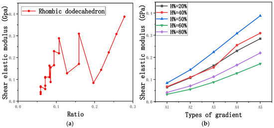 Compression elastic modulus perpendicular to the direction of the structural gradient of layered structure composed of two types of unit cells. (a) Compression elastic modulus perpendicular to the direction of the structural gradient of layered structure composed of rhombic dodecahedron; (b) Compression elastic modulus perpendicular to the direction of the structural gradient of layered structure composed of derived dodecahedron.