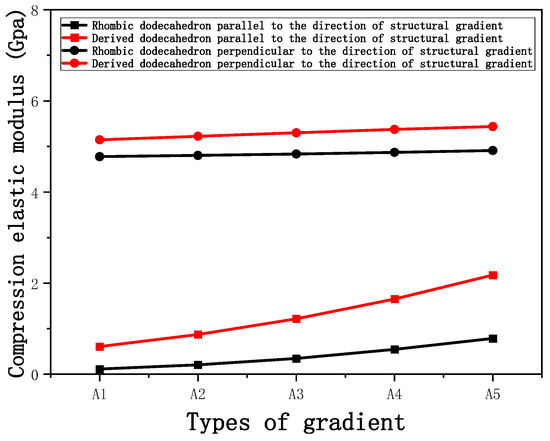 Compression elastic modulus parallel to the direction of the structural gradient of layered structure composed of two types of unit cells. (a) Compression elastic modulus parallel to the direction of the structural gradient of layered structure composed of rhombic dodecahedron; (b) Compression elastic modulus parallel to the direction of the structural gradient of layered structure composed of derived dodecahedron.