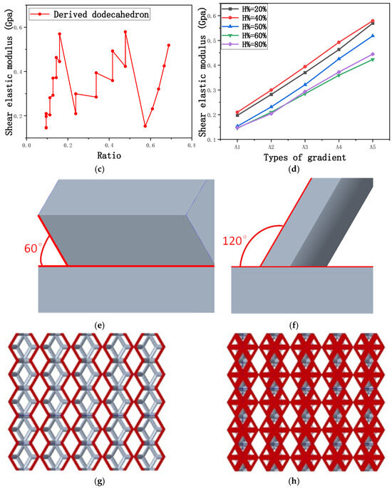 (a) Shear elastic modulus of rhombic dodecahedron with respect to Ratio; (b) Shear elastic modulus of rhombic dodecahedron with respect to types of gradient of cutting height in the shear direction; (c) Shear elastic modulus of derived dodecahedron with respect to ratio; (d) Shear elastic modulus of derived dodecahedron with respect to types of gradient of cutting height in the shear direction; (e) The angle between the structure of 40% cutting height of rhombic dodecahedron and solid part; (f) The angle between the structure of 60% cutting height of rhombic dodecahedron and solid part; (g) The contact shape between the solid part and the porous structure of 50% cutting height of the rhombic dodecahedron; (h) The contact shape between the solid part and the porous structure of 50% cutting height of the derived dodecahedron.