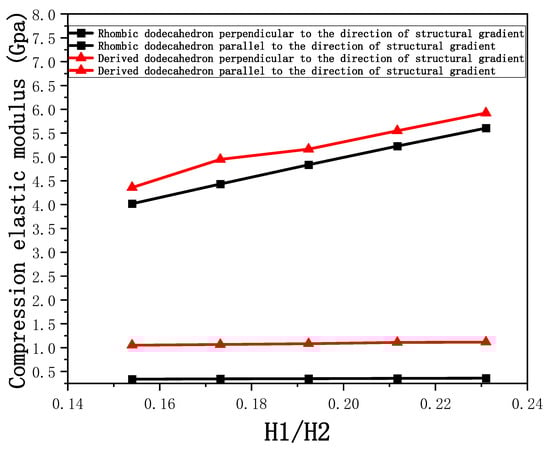 Compression elastic modulus parallel and perpendicular to the direction of the structural gradient of layered structure composed of two types of unit cells with respect to H1/H2.