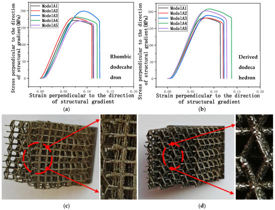 Through compression experiments, the force displacement curve can be obtained from the experiment, and the stress-strain curve can be calculated based on formulas Equations (2) and (3). Figure 14a,b shows the stress-strain curves of two models compressed perpendicular to the direction of structural gradient of layered structure.