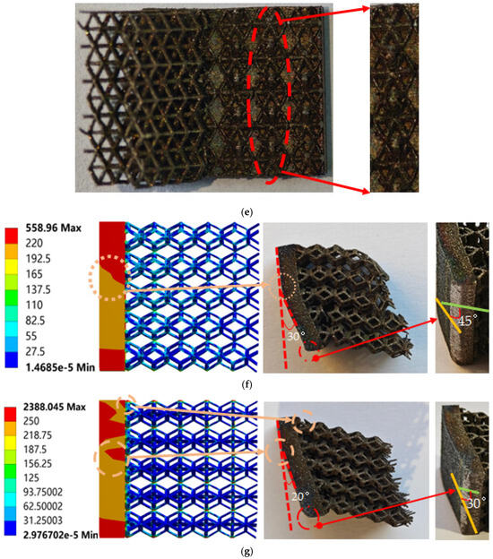 Figure 14f compares the simulation results of a rhombic dodecahedron with experimental data. As shown in the figure, with the increase in strain, the internal stress distribution within the solid area becomes uneven, leading to buckling in the structure. When the model is initially compressed, the height of the porous structure matches that of the solid structure. During compression, the solid structure, with its higher stiffness and smaller deformation, contrasts with the porous structure, which exhibits lower stiffness and greater deformation. As a result, the model tends to bend to the left, eventually resulting in a 30° offset. The failure observed at the solid bottom is a 45° shear failure, which confirms that the solid structure exhibits characteristics of ductile materials. Figure 14g compares the simulation results of the derived dodecahedron with experimental data. As shown in the figure, the failure mode of the derived dodecahedron is similar to that of the rhombic dodecahedron. However, due to the higher stiffness of the derived dodecahedron’s porous structure compared to the rhombic dodecahedron, the derived dodecahedron exhibits higher maximum internal stress and smaller deformation instability. From a working condition analysis perspective, the structural performance of the derived dodecahedron is not as favorable as that of the rhombic dodecahedron.