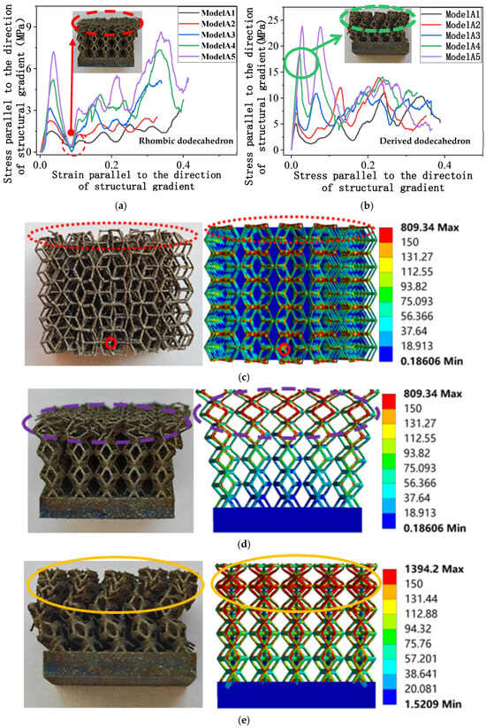 Stress parallel to the direction of the structural gradient of layered structure composed of two types of unit cells with respect to strain and the failure of two structures in compression parallel to the direction of structural gradient of layered structure composed of two types of unit cells. (a) Stress parallel to the direction of the structural gradient of layered structure composed of rhombic dodecahedron with respect to strain; (b) Stress parallel to the direction of the structural gradient of layered structure composed of derived dodecahedron with respect to strain; (c) Comparison between simulation and experiment on the top view of rhombic dodecahedron; (d) Comparison between simulation and experiment on the front view of rhombic dodecahedron; (e) Comparison between simulation and experiment on the front view of derived dodecahedron.