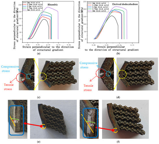 Stress perpendicular to the direction of the structural gradient of layered structure composed of two types of unit cells with respect to strain of solid thickness and the failure of two unit cells in compression perpendicular to the direction of structural gradient of layered structure composed of two types of unit cells. (a) Stress perpendicular to the direction of the structural gradient of layered structure composed of rhombic dodecahedron with respect to strain of solid thickness; (b) Stress perpendicular to the direction of the structural gradient of layered structure composed of derived dodecahedron with respect to strain of solid thickness; (c) The failure of rhombic dodecahedron with the solid thickness of 2 mm on the front view; (d) The failure of derived dodecahedron with the solid thickness of 2 mm on the front view; (e) The failure of rhombic dodecahedron with the solid thickness over 2 mm on the front view; (f) The failure of rhombic dodecahedron with the solid thickness over 2 mm on the front view.