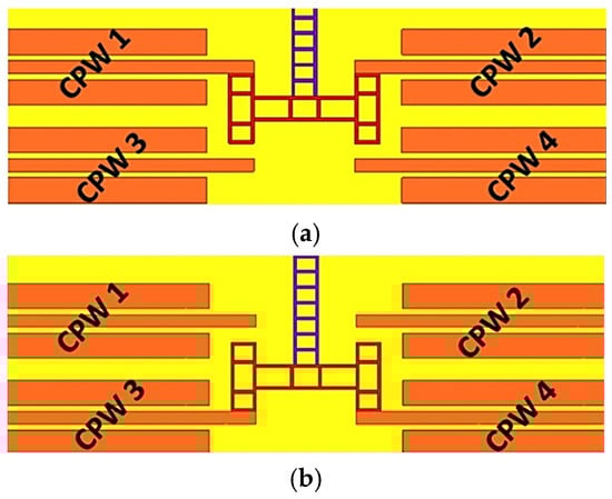 In STABLE STATE 1, the lateral displacement of the H-clamp results in contact with CPW lines 1 and 2, as shown in Figure 2a. Transitioning to STABLE STATE 2 involves the lateral movement of the H-clamp to establish contact with CPW lines 3 and 4, as in Figure 2b. This movement is facilitated by the coordinated operation of the actuators. To revert the switch to its default configuration of STABLE STATE 1, the device employs its bimodal switching capability, which enables the switch to alternate between its two stable states efficiently. This bimodal switching plays a vital role in the device operation, allowing for controlled lateral movements of the H-clamp between distinct pairs of CPW lines, thereby determining the operational state of the switch. The S-parameters of a bistable lateral RF MEMS switch in both stable states are shown in Table 1.