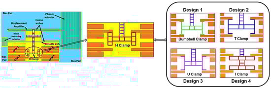 The H-clamp in a bistable switch is replaced with various reliable and mechanically stable lateral structures, such as dumbbell, T-shaped, U-shaped, and I-shaped clamps, as shown in Figure 3. Such lateral structures are designed and simulated in HFSS to analyze their RF performance. Among these structures, design 4 with an I-shaped clamp gives better RF performance when compared to the H-clamp structure.