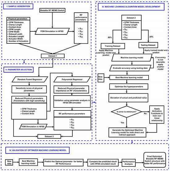 Implementing such ML algorithms to optimize the physical parameters of the proposed I-clamp-based RF MEMS switch significantly speeds up the design process. By predicting optimal configurations, ML provides a data-driven approach to designing a switch that is both efficient and innovative. The workflow of the proposed methodology for optimizing the I-clamp RF MEMS switch using an ML model is shown in Figure 4.