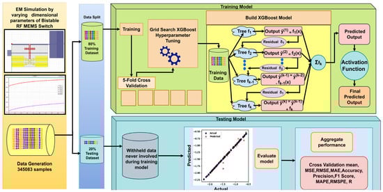 where is the length, is the width, is the thickness of the conductive path, and is the conductivity of the material. Impedance plays a crucial role in minimizing reflections and optimizing transmission. Hence, the S11 and S21 parameters’ dependence on the physical dimensions of the switch demonstrates nonlinear characteristics, especially notable in high-frequency operations where skin and proximity effects are significant. Such intricate and nonlinear relationships between the physical dimensions of RF MEMS switches and their associated S-parameters make the prediction of physical parameters from the RF performance more sensitive. Since the inverse modeling of RF MEMS switches with nonlinear characteristics is quite complex to achieve more accuracy, activation functions introduce nonlinearity to the XGBoost ML model, enabling it to learn complex patterns beyond simple linear decision boundaries. They also play a critical role in the model by allowing gradients to be propagated through the decision trees, facilitating effective learning and updates to the regularization term as in Equation (16):