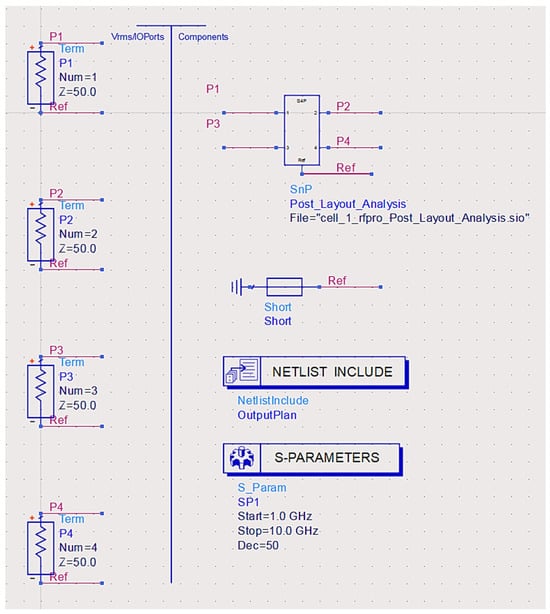 A test bench was created for the post-layout I-clamp RF MEMS switch in ADS to simulate the parasitic-extracted netlist using boundary conditions and excitation ports, as shown in Figure 10, to evaluate the S-parameter performance.