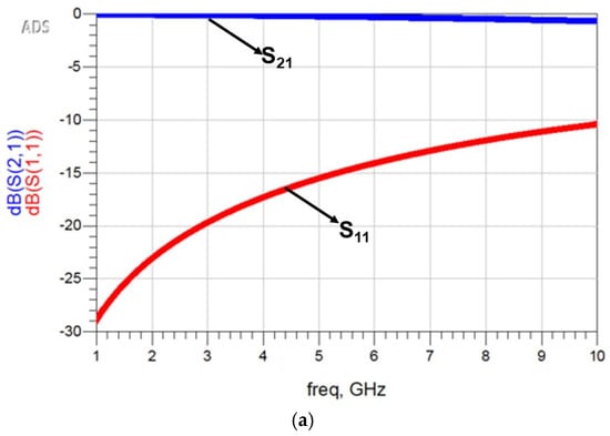 The simulation was carried out at an ambient temperature of 25 °C, with the operating frequency sweep from 1 GHz to 10 GHz. This setup was used to extract return loss, insertion loss, and isolation of the proposed switch, as shown in Figure 9.