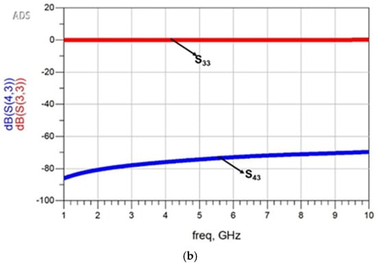 S-parameters of the proposed I-clamp RF MEMS switch from the ADS netlist-based test bench simulation. (a) S11 and S21. (b) S33 and S43.