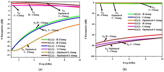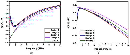 The electrothermally actuated bistable lateral RF MEMS switch structure used for low-frequency wireless applications was modified to improve its RF performance at a higher frequency. Structural modifications to the H-clamp enhanced its electromagnetic performance, reducing RF losses essential for high-frequency applications, thus meeting stringent RF performance requirements. Thus, the H-clamp structure of the switch was replaced by various lateral switch structures, and it was observed that the I-clamp structure showed better insertion loss and isolation. As shown in Figure 12, the I-clamp (design 4) bistable RF MEMS switch’s S11 was −10.5 dB, S21—−1.5 dB, S33—−0.3 dB, and S43—−74 dB at 7 GHz.