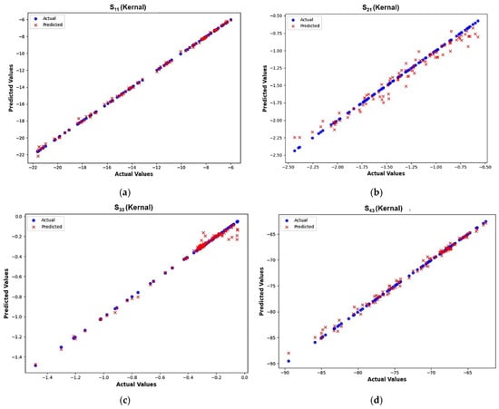 Actual vs. predicted values obtained from the kernel-based XGBoost direct ML model. (a) S11. (b) S21. (c) S33. (d) S43.