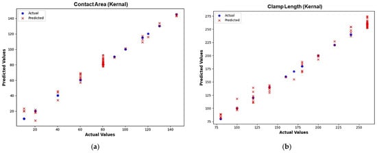Actual vs. predicted values obtained from the kernel-based XGBoost direct ML model. (a) Contact area. (b) Clamp length. (c) CPW thickness. (d) Frequency.