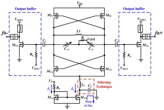 The NMOS current mirror can use voltage to limit the size of the tail current, limiting the total power dissipated by the voltage-controlled oscillator. The channel width ratio of the transistors MN1 and MN2 is 16:1. However, the current mirror transistor in the tail current has a nonlinear effect. When the transistor operates in the nonlinear region, noise will be introduced. The second harmonic signal is mixed with the fundamental frequency signal, and the signals are multiplied to produce a signal whose frequency is close to the oscillation frequency, and this new signal will transfer the 20 noise to near the oscillation frequency, reducing the phase noise of the circuit [4]. Therefore, a set of LC filters with a resonant frequency at 20 are added to the design of this section to filter the noise at 20 through the capacitor to the ground. The inductor provides a high impedance of the circuit near the resonant frequency and blocks the passage of the 2f0 signal. The function of the capacitor is to compose a resonant circuit with the inductor [5]. Finally, open-drain buffers MN5 and MN6 are used at the output, and bias Tee is used externally, which can be used to isolate RF and DC signals and enhance the output power.