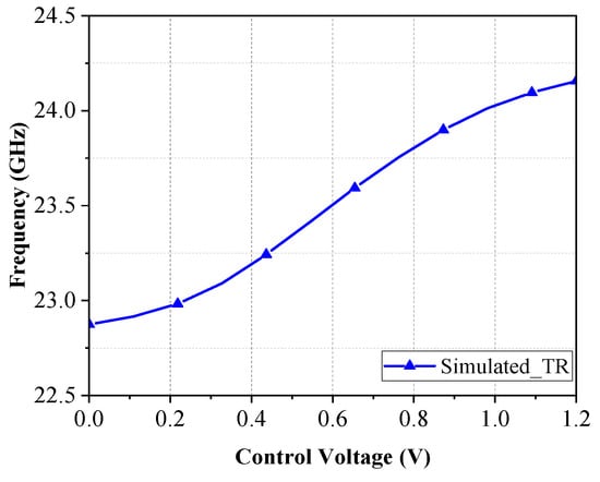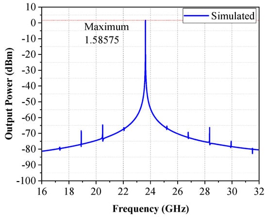 Figure 3 is the simulated output spectrum of the voltage-controlled oscillator after the implementation of the buffer amplifier. The output oscillation frequency is 23.63 GHz and the output power is 1.58 dBm when Vctrl is 0.6 V, while the frequency range is from 22.8~24.15 GHz, as shown in Figure 4, and the tuning range is 5.45%. Figure 5 shows the simulated results of phase noise after adding a noise filter circuit. The phase noise simulation result is −95.8 dBc/Hz at a carrier offset of 1 MHz. Obviously, the phase noises are improved by about 8.3 dB by adding the noise filter circuit.