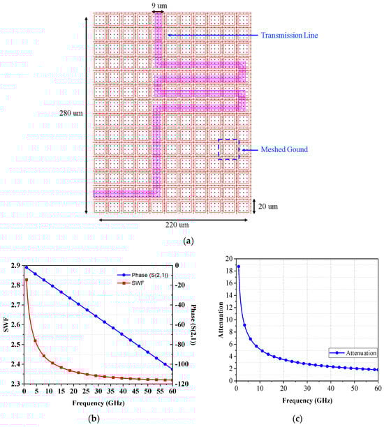 In the design of transmission lines, the slow wave factor (SWF) plays an important part [8]. The slow wave factor refers to the measurement of the loss and distortion experienced by electromagnetic waves propagating in transmission lines. We can calculate the length of the λ/4 transmission line at 48 GHz to be 672 um based on Equation (3), as shown in Figure 6a. The transmission line is winding according to this length. The slow wave factor and phase after the simulated winding are shown in Figure 6b, and the phase attenuation is shown in Figure 6c.
