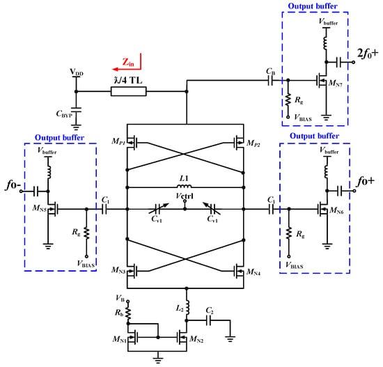 The schematic of the 48-GHz push–push VCO is shown in Figure 7. This VCO is composed of the cross-couple pair of MN3, MN4, MP1, and MP2, the LC tank of L1 and Cv1, the NMOS current mirror of transistors MN1 and MN2 with a channel width ratio of 16:1, and the LC noise-filtering circuit. In the traditional LC architecture, the inductor used as the resonant circuit can usually be replaced by a /2 transmission line. However, this transmission line is the state of one wavelength, so the oscillation frequency at 2f0 is in phase and multiplies, f0 is the differential signal cancellation, and an oscillation signal of 2f0 is generated; this is extracted through the AC coupling capacitor CB through open-drain buffers MN7 to output a double-frequency oscillation signal, and /4 of the transmission line in the circuit is in the 2f0 state. It functions as an RF Choke in the circuit to isolate RF signals. Zin represents the input impedance of the transmission line. The load impedance ZL in Equation (4) is 0, Z0 is the characteristic impedance of the transmission line, and L is /4. It can be known that the signal under the /4 transmission line is infinite and is an open circuit state.