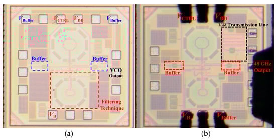 Chip photo of the proposed (a) 24-GHz and (b) 48-GHz push–push VCOs.