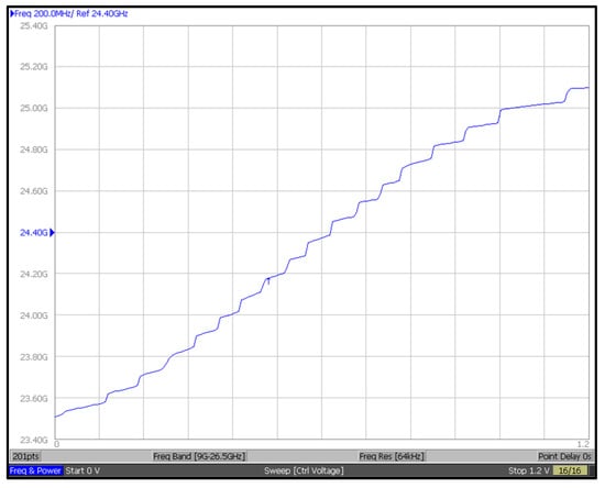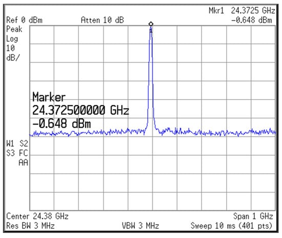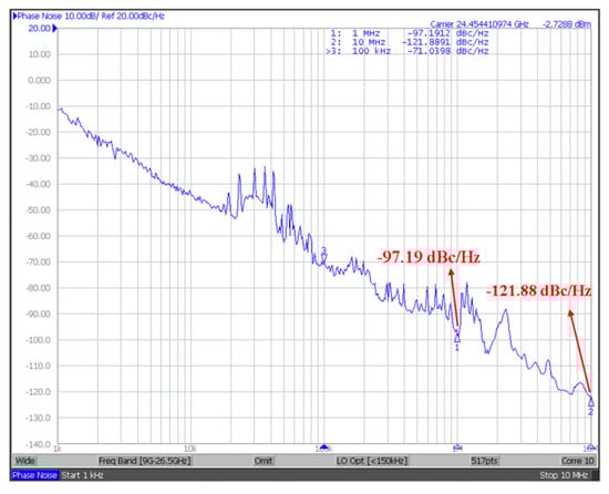 Figure 9 shows the measured output spectrum of the proposed VCO; the measurement DC current of VCO without buffer is 5.1 mA, 6.12 mW. When Vctrl is 0.6 V, the output frequency of the voltage-controlled oscillator is 24.37 GHz and the output power is −0.65 dBm. Figure 10 shows the measured tuning range of the proposed 24 GHz VCO. When the control voltage Vctrl varies from 0 to 1.2 V and the frequency range is 23.51~25.09 GHz, the tuning range is 6.5%. When measuring the tuning range, we set the control voltage sweep points to 201 points. This will cause the VCO output frequency to change discontinuously when the sweep range is wide. If a higher number of points (such as 801 points) is used for scanning, the curve will become smoother and more continuous. Figure 11 shows the measured phase noise of the proposed 24 GHz VCO; the phase noise measured at a 1 MHz offset is −97.2 dBc/Hz, and that measured at a 10 MHz offset is −121.9 dBc/Hz.