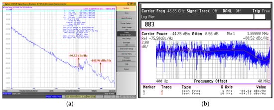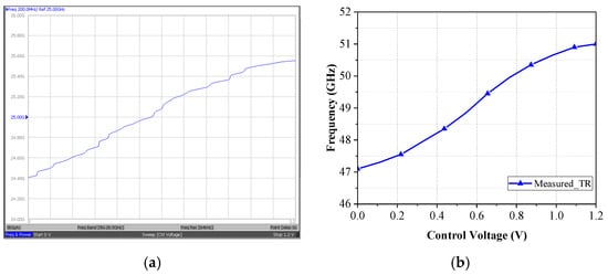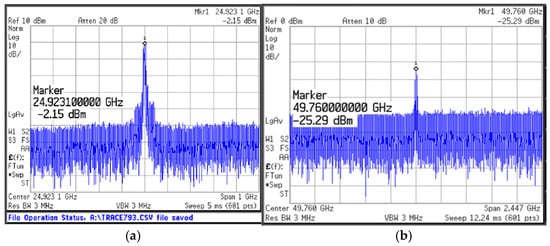 Figure 12 shows the measured output spectrum of the proposed push–push VCO. The measurement DC current of the design without buffers is 5.74 mA, and Pout is 6.89 mW. In Figure 12a, when Vctrl is 0.6 V, the output frequency of the f0 is 24.92 GHz and the output power is −2.15 dBm. In Figure 12b, when Vctrl is 0.6 V, the output frequency of the 2f0 is 49.76 GHz and the output power is −25.29 dBm. Figure 13 shows that the measured tuning range of the push–push VCO. With the control voltage Vctrl varying from 0 to 1.2 V, the frequency range of f0 is 24.1~25.9 GHz and that of 2f0 is 47.1~51 GHz. Figure 14 shows the measured phase noise of the VCO. In Figure 14a,b, the measured phase noises of f0 at a 1 MHz offset and of 2f0 at a 1 MHz offset are −90.32 dBc/Hz and −80.52 dBc/Hz, respectively.
