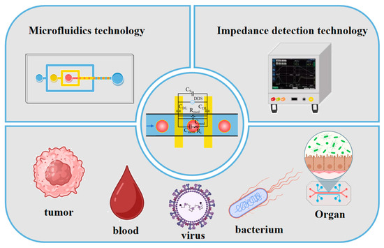 In summary, this review systematically examines recent advancements in the integration of microfluidic and impedance sensing technologies, along with their technological evolution in biosensing applications. Starting from the fundamental principles of microfluidic technology and impedance spectrum analysis, the detection mechanisms based on fluidic characteristics and impedance analysis were introduced, with particular emphasis on the construction logic of cellular impedance equivalent circuit models. Detection systems were classified into static and dynamic categories according to cellular motion states, with their design principles and critical factors for enhancing detection accuracy being elucidated, respectively. Finally, the innovative applications were systematically categorized into four domains: tumor detection, blood detection, OOC, and microbial detection based on biological target dimensions.