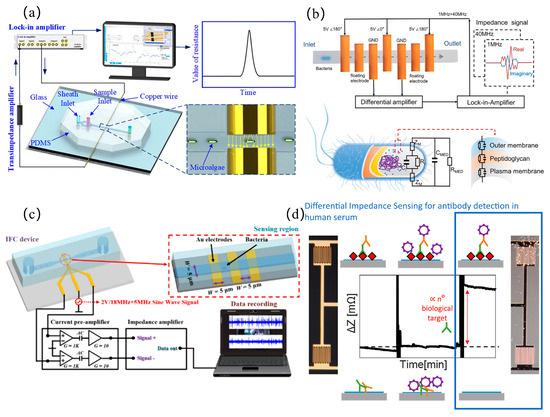 Microbial detection: (a) 3D-architected microfluidic impedance cytometer with dual cylindrical electrodes and embedded microchannels for enhanced cellular interrogation (reprinted with permission from [56], published by Royal Society of Chemistry, 2024); (b) single-bacterium-resolution impedance cytometry platform enabling rapid antimicrobial susceptibility testing via electrophysiological profiling (reprinted with permission from [59], published by Wiley-VCH Verlag, 2024); (c) microfluidic device integrated with convolutional neural network-based deep learning framework for automated interpretation of impedance flow cytometry data to achieve precision bacterial classification (reprinted with permission from [61], published by American Chemical Society, 2024); (d) differential impedance biosensing system implementing phase-sensitive signal demodulation for label-free detection of anti-dengue viral antibodies in low-concentration sera (reprinted with permission from [62], published by Elsevier, 2022).