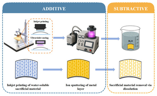 Inkjet printing has become a primary technique for manufacturing flexible and conformal electronics due to its digital control, design flexibility, and material compatibility. However, its direct deposition nature results in weak adhesion between metal films and substrates, as it mainly relies on van der Waals or capillary forces, which severely limits its broader application in these fields. To address this limitation, we proposed an additive–subtractive manufacturing method based on a water-soluble sacrificial layer. First, the sacrificial material is inkjet-printed onto the substrate. Then, ion sputtering is employed to bombard the surface with high-energy ions, enabling metal atoms to embed into the substrate and form a strongly adhered conductive layer. Finally, the substrate is immersed in water, dissolving the sacrificial layer and detaching the undesired metal, thereby achieving selective retention of the conductive pattern. Experimental results demonstrate that the optimized water-soluble material, with tailored viscosity and surface tension, enables a patterning resolution of ±10 μm. The adhesion strength of the sputtered metal layer is 5.2 times greater than that of inkjet-printed silver nanoparticles. This method was further applied to fabricate conductive patterns on a curved surface with a 91 mm radius confirming its feasibility and adaptability for complex 3D surfaces.