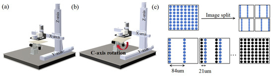 Subsequently, sacrificial patterning is performed using a custom-developed five-axis inkjet printing platform. As shown in Figure 2a,b, the system supports both planar and curved surface printing modes. For flat substrates, the C-axis remains stationary while the printhead moves along the X, Y, and Z axes across the surface. For curved substrates, the C-axis dynamically rotates according to the 3D curvature of the substrate, keeping the printhead perpendicular to the local surface at all times. The platform is equipped with a piezoelectric printhead array (GH2220, Ricoh, Tokyo, Japan), consisting of two rows of 192 nozzles each. The default resolution is 300 dots per inch (DPI), corresponding to a droplet spacing of 84.5 µm. To enhance the density and uniformity of the sacrificial pattern, a precision printing strategy integrating image preprocessing and fine-axis displacement was developed (Figure 2c). Specifically, the original 1200 DPI pattern is decomposed via interlaced sampling into multiple 300 DPI sub-patterns. After printing each sub-pattern, the printhead is shifted by 21.1 µm along the print direction—matching the droplet pitch at 1200 DPI—until all sub-patterns are sequentially printed. This achieves a final effective resolution of 1200 DPI with a droplet spacing of 21.1 µm. To ensure the compactness and structural stability of the water-soluble sacrificial material, each printed layer is immediately cured using a 395 nm, 20 W UV light source. This print–cure cycle is repeated four times to build a uniform, densely packed sacrificial layer.