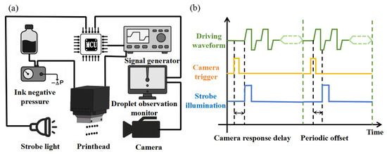 (a) Schematic of the droplet observation platform; (b) timing diagram of the printhead waveform synchronized with the imaging system.