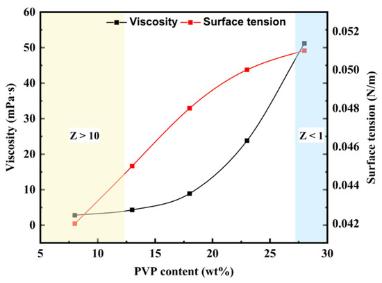 As shown in Figure 5, increasing the PVP content from 8 wt% to 26 wt% leads to a significant rise in ink viscosity—from approximately 5 mPa·s to nearly 50 mPa·s—exhibiting an exponential growth trend. This behavior is attributed to the entanglement of high-molecular-weight PVP chains in the solution, which increases internal flow resistance. In contrast, the surface tension increases only slightly (from 0.043 N/m to 0.051 N/m), primarily due to PVP’s mild inhibitory effect on the migration of other surfactant components. In the figure, the non-printable regions corresponding to Z > 10 (low-viscosity ink) and Z < 1 (high-viscosity ink) are marked with light yellow and light blue shading, respectively. These results indicate that only when the PVP mass fraction is within the range of approximately 13–26 wt% does the Z number fall within the printable window (1–10).