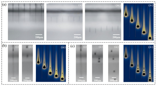 Comparison of experimental droplet jetting images and COMSOL simulation results for inks with different PVP concentrations: (a) 18 wt% (i–iii Droplet ejection process recorded by a high-speed droplet observation system; iv Simulated droplet dynamics modeled using COMSOL Multiphysics.), (b) 13 wt% (i–ii Droplet ejection process recorded by a high-speed droplet observation system; iii Simulated droplet dynamics modeled using COMSOL Multiphysics.), and (c) 23 wt% (i–iii Droplet ejection process recorded by a high-speed droplet observation system; iv Simulated droplet dynamics modeled using COMSOL Multiphysics.).