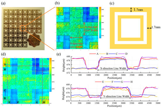 Analysis of forming accuracy. (a) Planar test sample; (b) surface profile measurement of the selected region; (c) standardized conductive pattern; (d) location of randomly selected profile lines; (e) cross-sectional profiles in the X and Y directions.