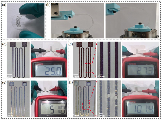 Flexible strain sensors fabricated on PET substrate. (a) Strain sensor fabricated on a PET film; (b) test setup of cyclic bending; (c) additive–subtractive sample before bending; (d) additive–subtractive sample after 500 bending cycles; (e) inkjet-printed sample before bending; (f) inkjet-printed sample after 500 bending cycles.