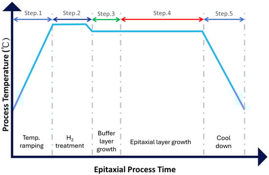 - Step 3 (Buffer Layer Growth): A 1 µm-thick SiC buffer layer with a doping concentration of 1 × 1018 cm−3 was grown at 1600 ± 5 °C using SiHCl3 and C2H4 as precursors, with a C/Si ratio of 0.9, and a growth rate of 15 µm/h.